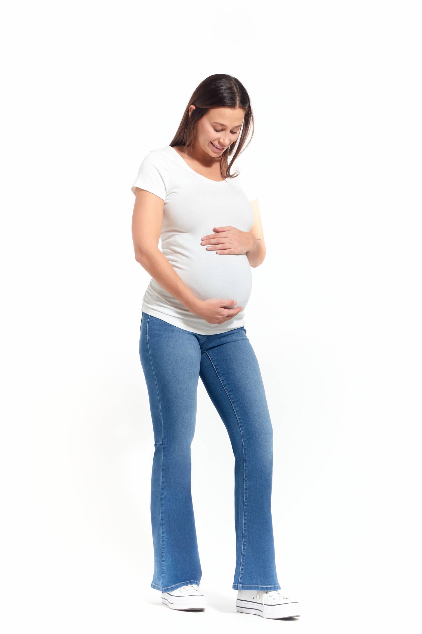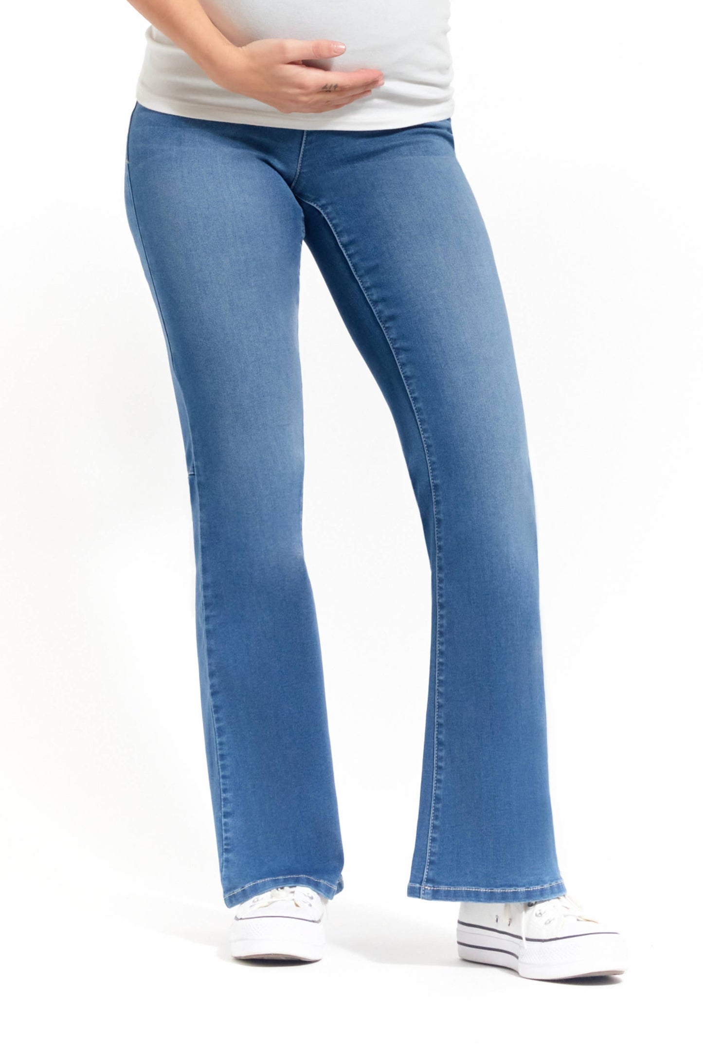 Made from buttery-soft stretch denim, these full-length bootcut jeans feature an over-the-bump waistband for secure, comfy support throughout each trimester. Features our brand new wash Serenity in fan favorite Better Butter (so soft, so luxe, so comfortable, so elevated and so polished).