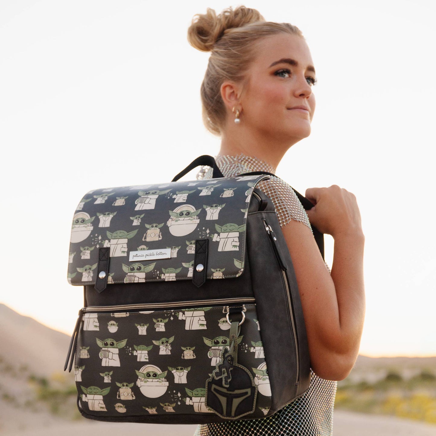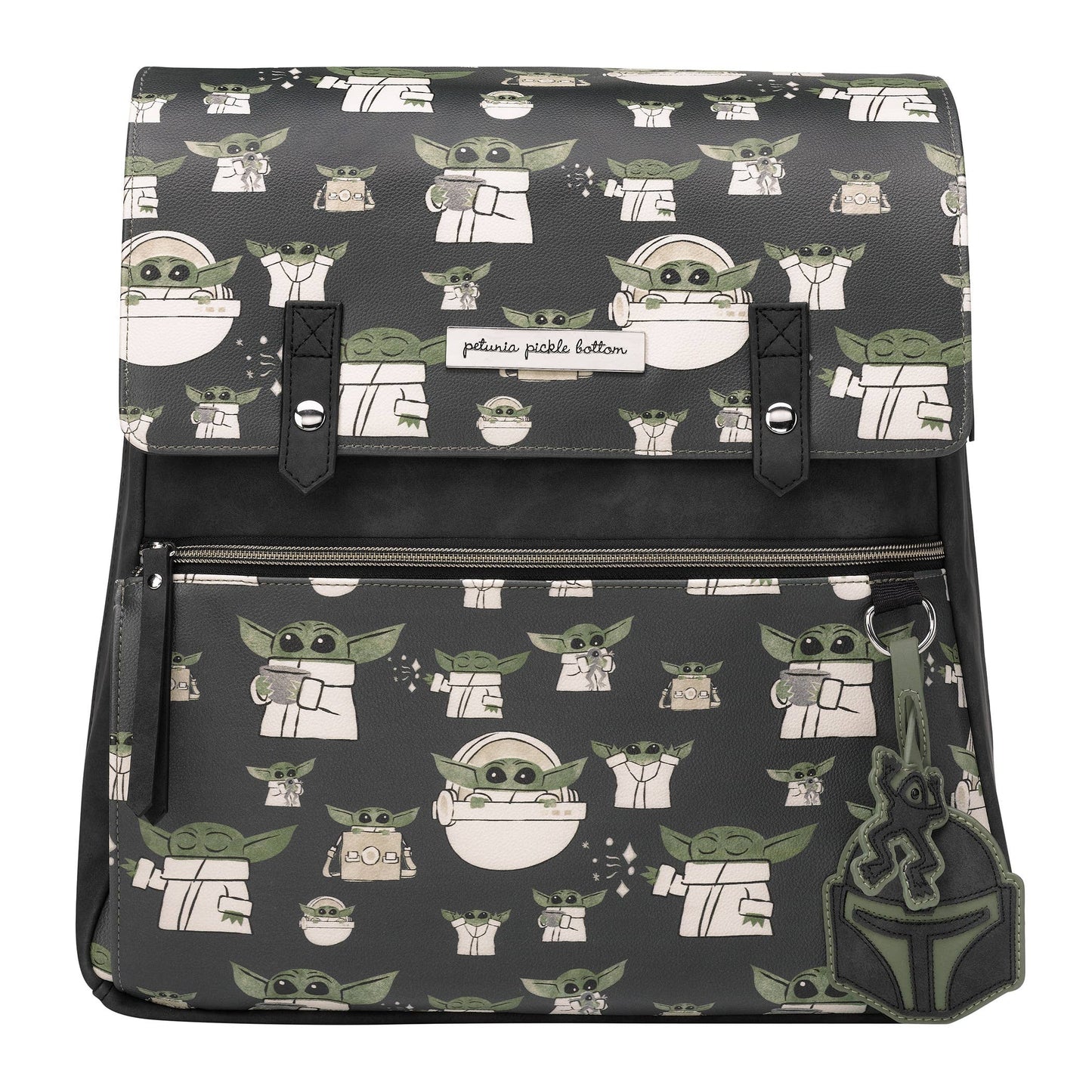 Introducing The Child collection, an exclusive collaboration between Lucasfilm’s The Mandalorian and Petunia Pickle Bottom. Join Grogu™️ as he naps, snacks, and playfully explores the wild and wonder-filled universe. Styled in whimsical watercolor sketches on a black, matte leatherette with silver hardware. It’s the perfect collection to stow your youngling’s essentials, whether your next adventure takes you across town or to a galaxy far, far away….