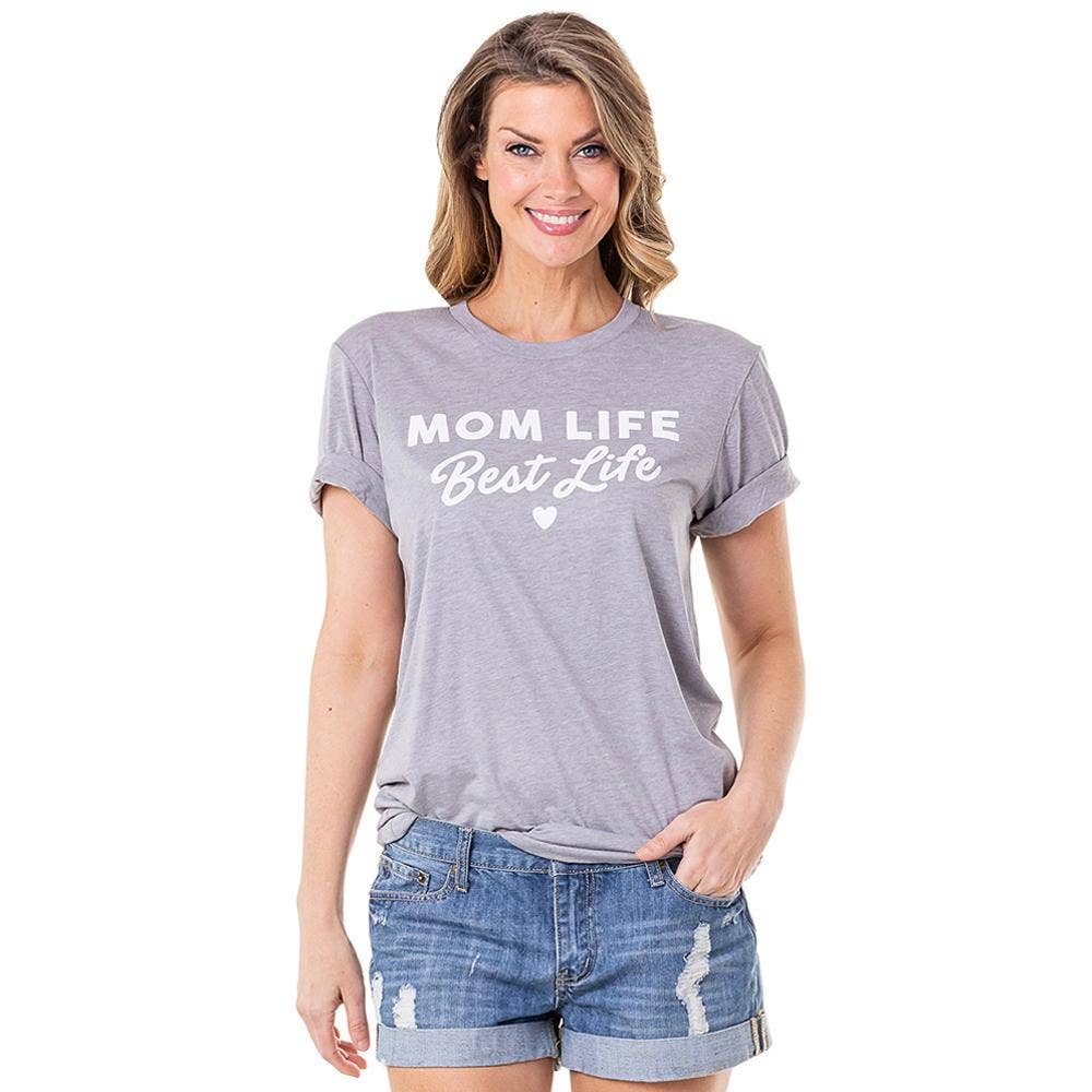 Mom life best life graphic t-shirts are designed by Katydid. Round neck short sleeve tri-blend tee. Unisex sizing (fits true to size). 65% polyester 35% viscose.