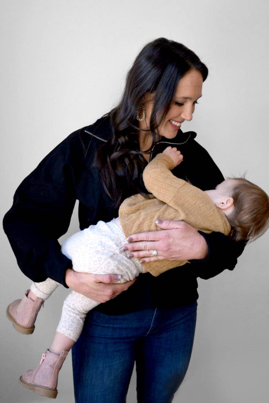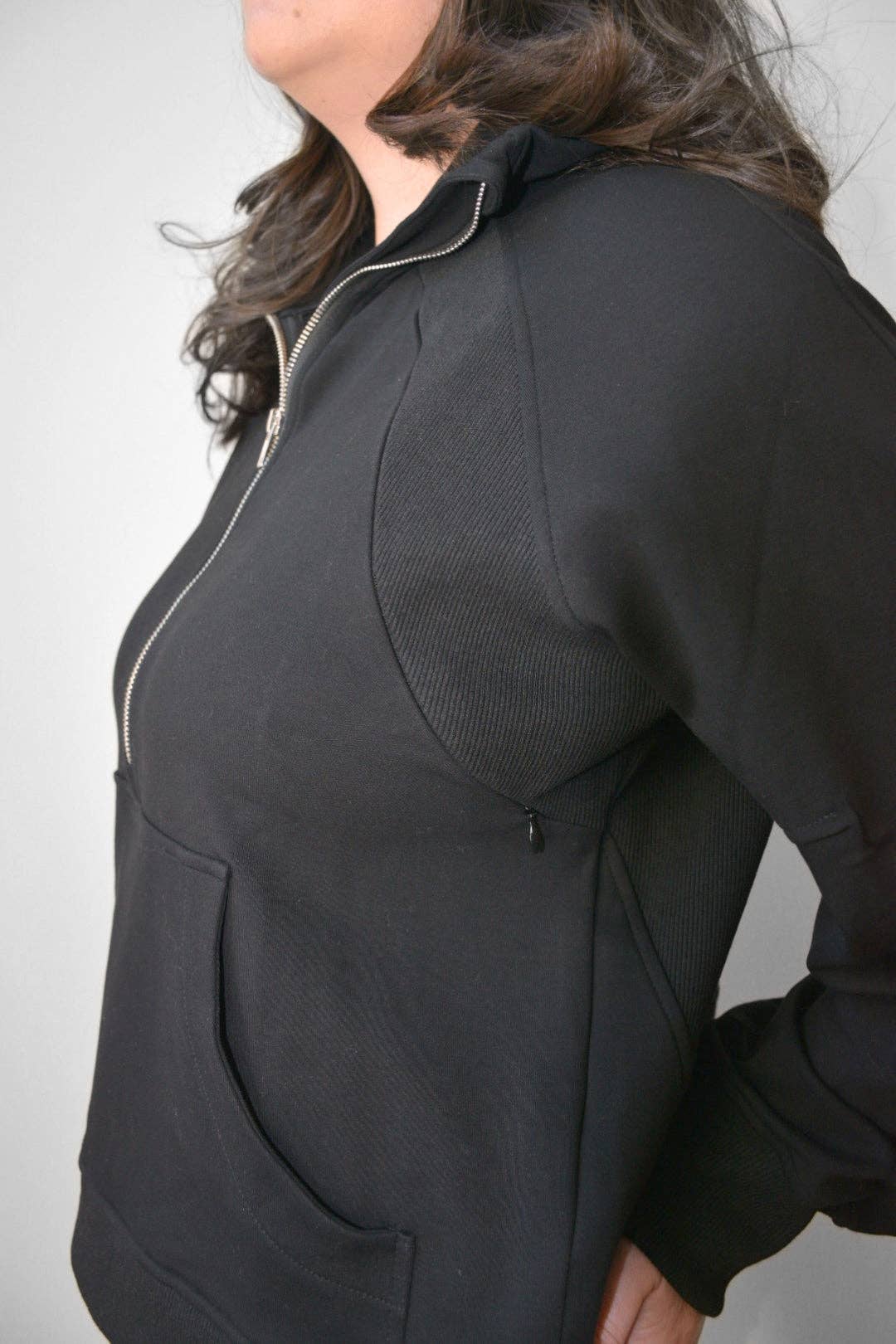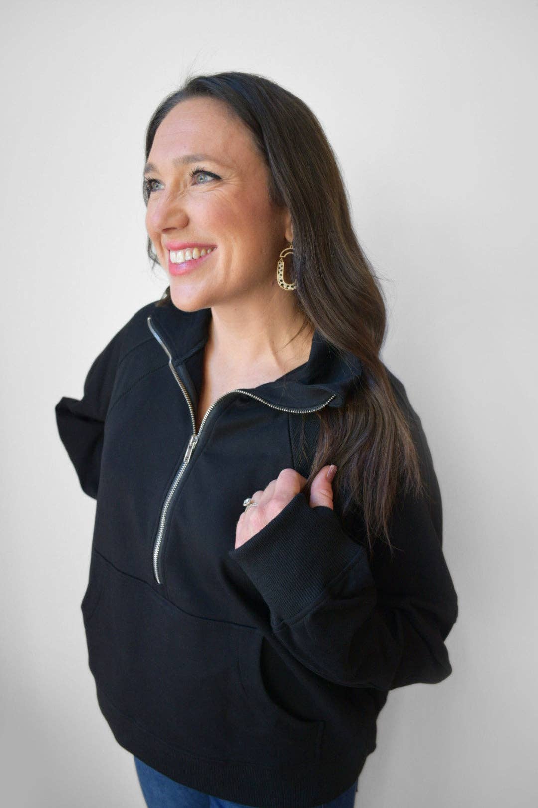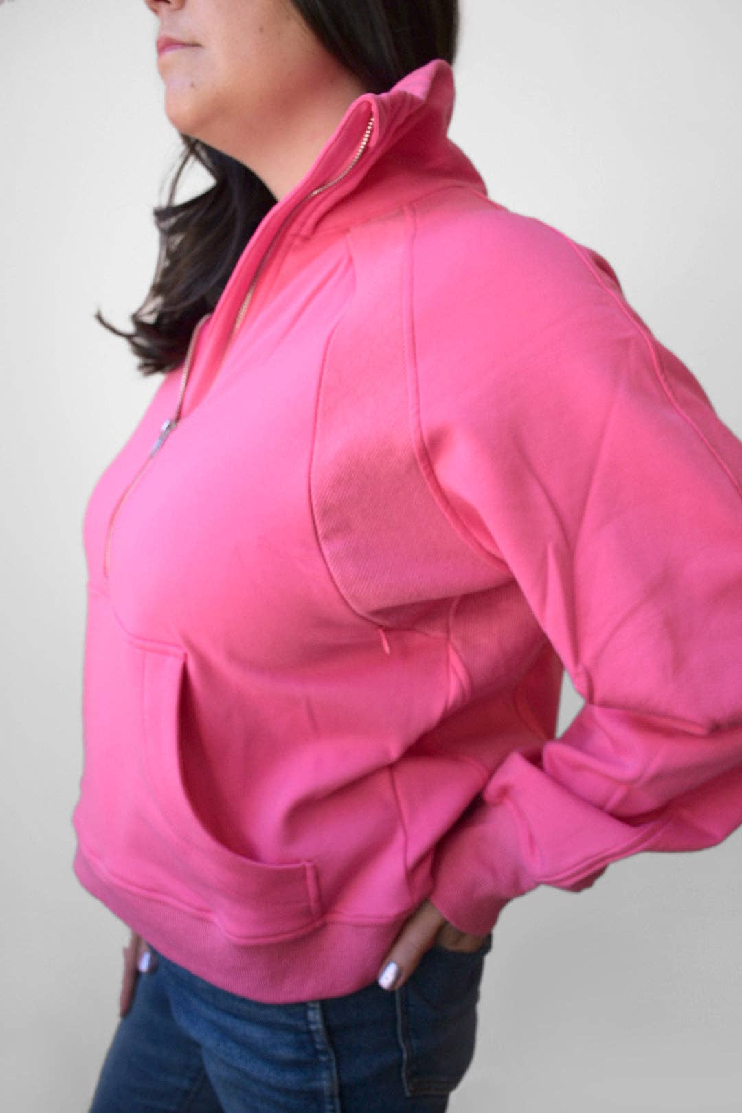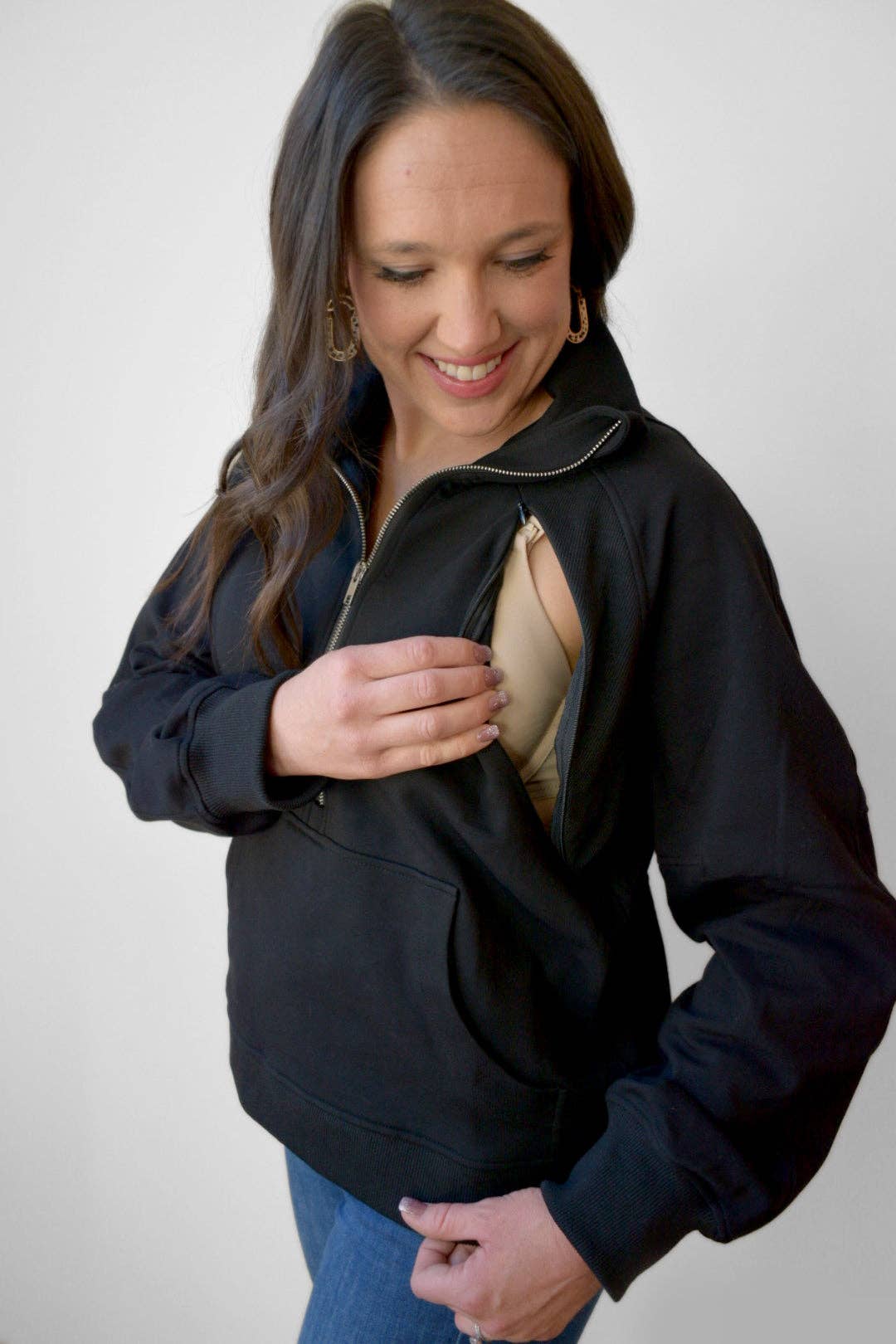 Hidden invisible zippers in the ribbed panel of this sweatshirt add new and improved functionality to everyone's favorite 1/2 zip sweatshirt silhouette. Whether you're nursing pumping, or just love a 1/2 zip sweatshirt you'll adore this new release from Movemama. With a cozy and relaxed fit you'll find yourself reaching for this sweatshirt everyday. The simplified sizing of this sweatshirt is due to the oversized silhouette.