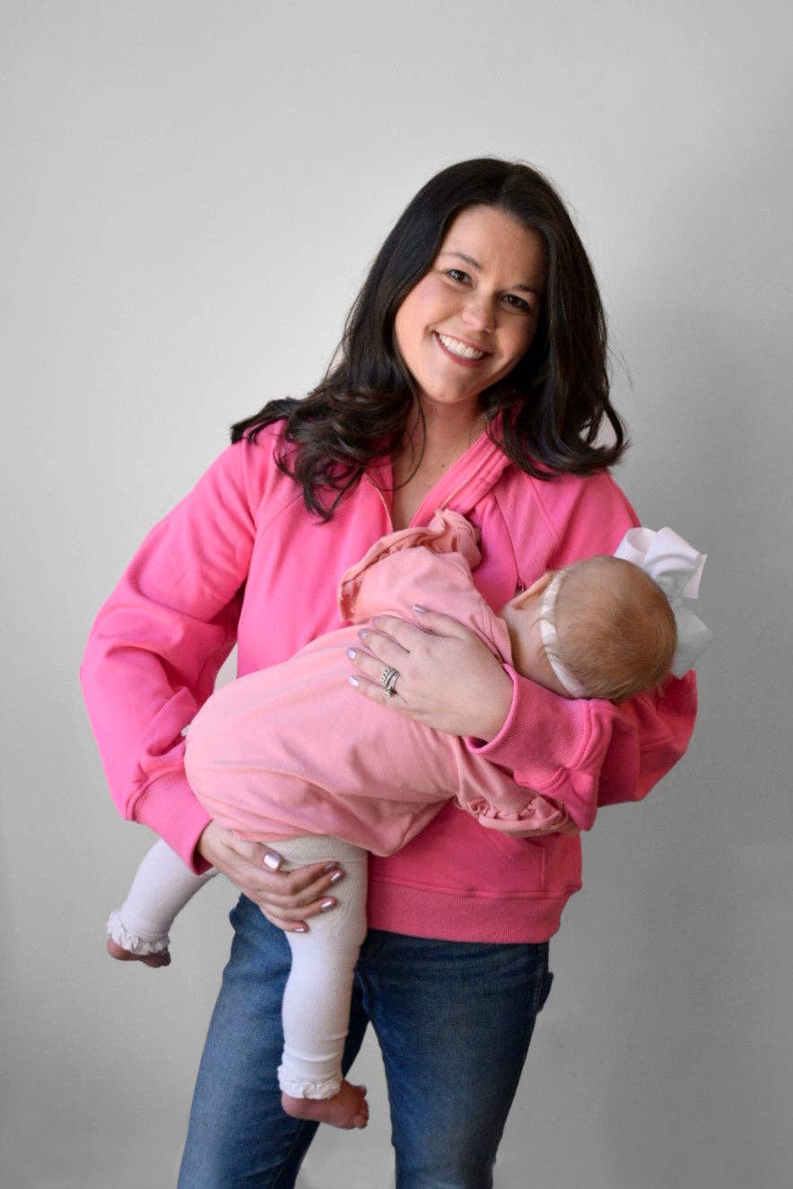 Jessica (feeding babies in brown) is wearing an XS/S in these photos and Emily (feeding baby in pink) is wearing the M/L.